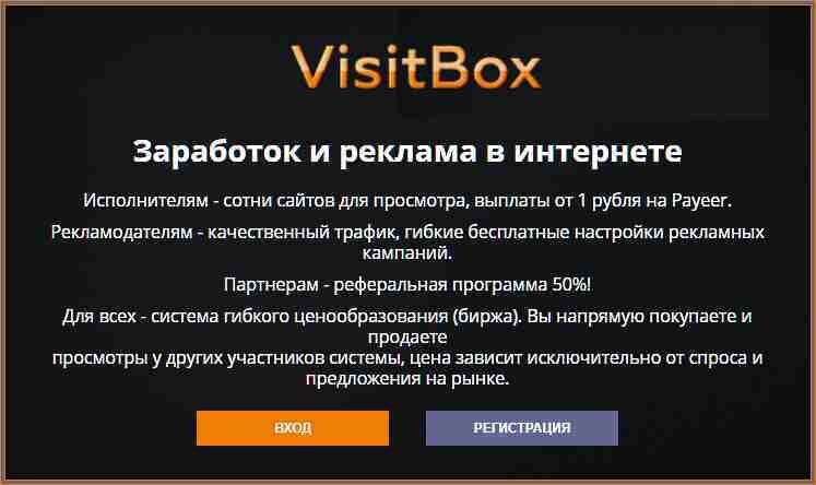 Сегодня речь пойдёт о сайте,который называется Visit Box.Visit Box даёт возможность зарабатывать на просмотре рекламных объявлений,либо каких-то страниц сайтов,так называемые визиты.Визиты-это внутренняя валюта сайта,которая может преобразовываться в привычные нам рубли,на так называемой внутренней бирже этого сайта,то есть,когда у вас достаточное