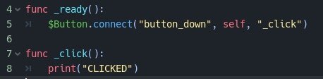 Мы берем кнопку, и подключаем сигнал «button_down» к самому себе (self), и выводим отработку сигнала в функцию «_click» Во время написания кода , годо предложит вам весь список сигналов, так что не обязательно знать написание каждого из сигналов. Ну а далее нам остается только описать функцию «_click». В моем случае я просто вывел в вывод текст «CLICKED» Мы так же можем выводить в коннекте кастомные аттрибуты. Например какое то число или текст. Либо передать собственное имя. Помимо этого в годо есть возможность создавать свои сигналы.