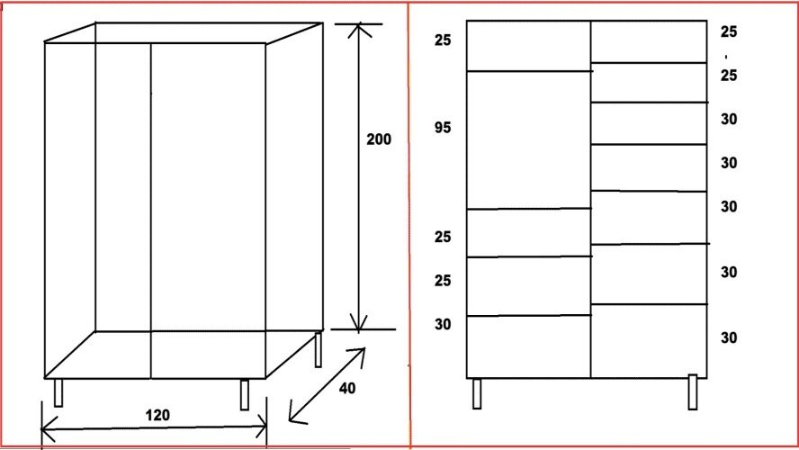 Обязательно, перед тем как начать работу, сделайте чертёж шкафа. Со всеми разметками и размерами. Наш можно увидеть чуть ниже.