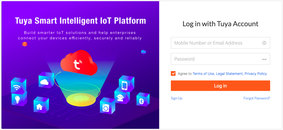 Переходим на сайт iot.tuya.com и создаём новую учётку по кнопке SIgn Up: