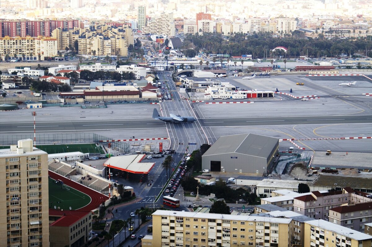 Гибралтар - это крошечное государство на юге Испании площадью 7 км². Там умудрились разместить аэропорт, взлётно-посадочная полоса которого обоими краями упирается в море , а по середине её пересекает оживлённая городская улица. Которую на время взлётов перекрывают шлагбаумами