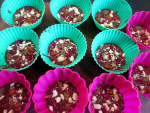 - Растопленный шоколад сразу же разливаем в силиконовые формочки. Далее ждем, когда он слегка остынет и начинаем укладывать на него измельченные заранее цукаты, орехи, цедру апельсина (можно лимона), изюм. После этого оставляем шоколад с наполнением застывать.