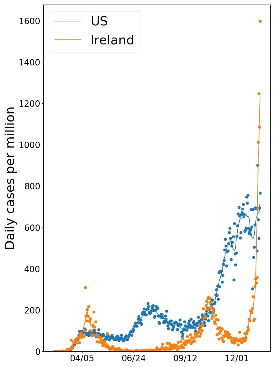 Начнём со свежей новости о новом британском штамме. На слайде график распространения ковида в Ирландии [источник]. 25% уже заражены новым штаммом. Скорость распространения выше на 70%, чем у штамма в США. Есть основания полагать, что этот штамм появится у нас и будет развиваться со стремительной скоростью.