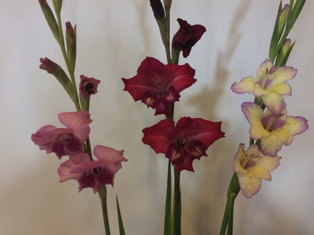 Я не думаю, что многие люди знают, что название этого шоу на самом деле появляется в фильме Уоллеса и Громмита «Проклятие кролика-оборотня». Есть около восьми классов гладиолусов, и в обычные годы я бы их заполнял, но в этом году погода и сезон вместе уничтожили большинство заявок, и, поскольку я был в Испании в течение недели, мои цветы пострадали от элементов. Мне только что удалось обработать эти три низкокачественных саженца без цветков: Anne Milton слева, Marie Sandham в центре и новый саженец справа. Они не заслужили многого, зато получили лучший экспонат и медаль. Если бы я судил, не думаю, что наградил бы за это медалью. У всех остальных радостных на шоу не было двух или трех нижних цветочков, и они выглядели немного испачканными погодой.