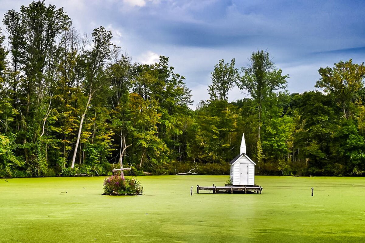 Если вы действительно хотите устроить небольшую, скрытную свадьбу - компактная церковь площадью 30 квадратных футов, окруженная водой со всех сторон - будет для вас идеальным местом для ее проведения. Церковь была построена на деревянных сваях, в 1989 году, на небольшом причале в Онейде, штат Нью-Йорк. Слегка смещенный от центра проржавевший крест, закрепленный серыми камнями, предупреждает