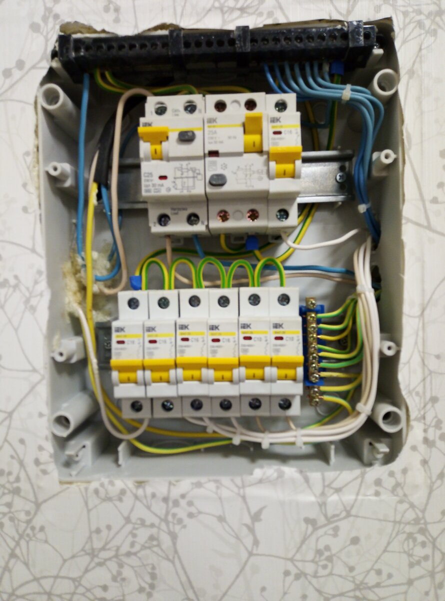 Нужно продумать, где расположить щит. Сначала супруг собирал щит на коленке, затем его установил в коридоре, куда уже было подведена целая куча проводов. Все подходящие кабели были подписаны, поэтому подключить все к нужным клеммам было уже не сложно. Только вот кропотливая это работа ,тем более уже вечером под светом фонарика от телефона! Ранее вся защита электрики в квартире была в общем щите на лестничной площадке. Смотреть на то, что там творится без слез сложно. Весь алюминиевый кабель в квартире «защищал» автомат на 32 ампера… В общем, вводной кабель из этого щита, автомат и старый дисковый счетчик мы тоже заменили на новый.