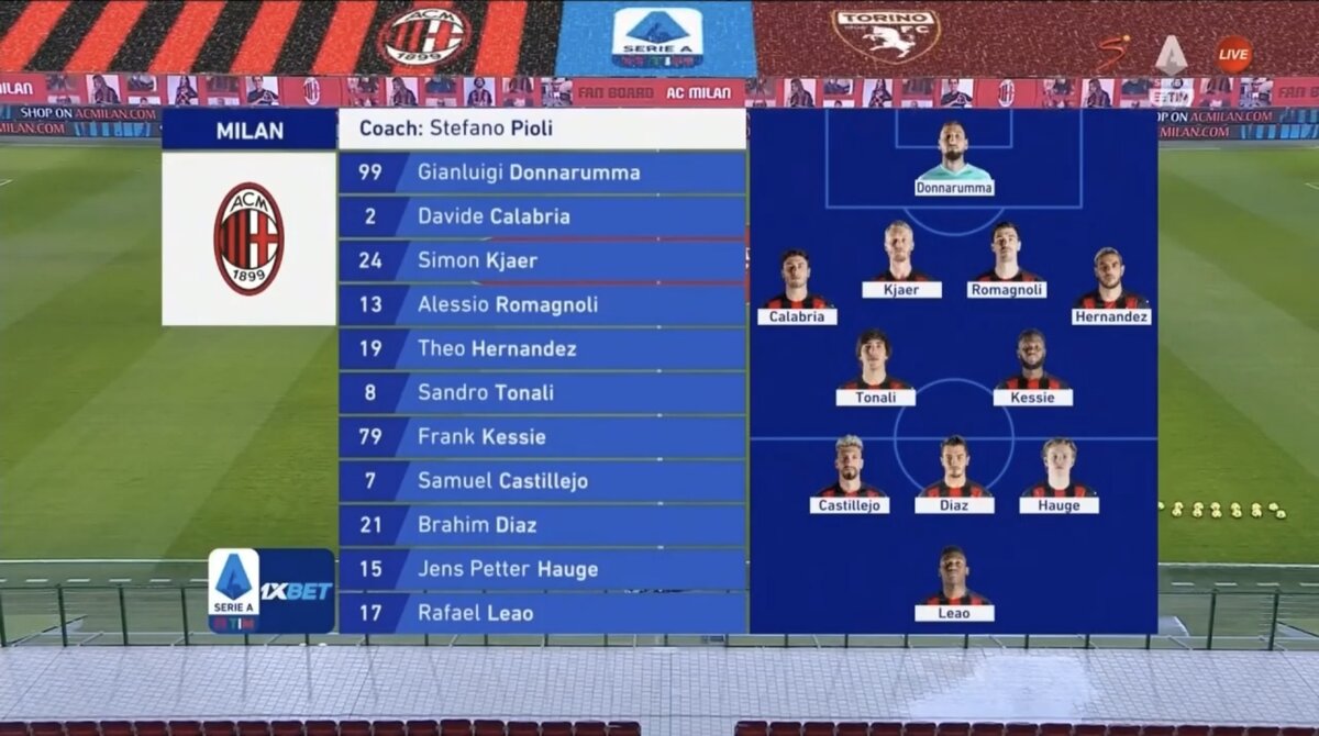 Как и в матче с Юве у Милана был очень ограничен состав. По-прежнему с травмами Беннасер, Салемакерс, Габбия, Ребич, Крунич. Да ещё и после матча с Юве небольшое повреждение получил один из ключевых созидателей атак - Чалханоглу, поэтому остался в запасе.
