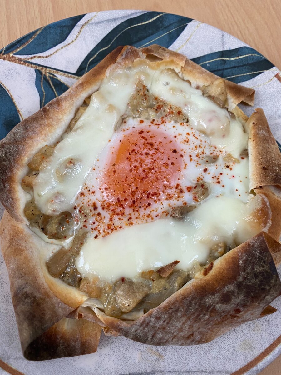 В сформировавшееся углубление, кладём 3-4 ложки приготовленной нами начинки. Ложкой в ней формируем небольшое углубление, чтобы яйцо осталось в середине. Разбиваем туда яйцо, выкладываем сыр и отправляем в разогретую до 180 градусов духовку, на 5-10 минут.