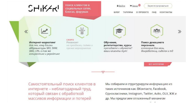 А сервис крайне полезен – он занимается поиском потенциальных клиентов в социальных сетях, блогах, форумах. Собственно, отсюда и название сервиса – «shikari» с английского переводится как «охотник». • Если кратко, то суть сервиса такова: Специальное мощное программное обеспечение круглосуточно мониторит самые крупные социальные сети, блоги, форумы, доски объявлений. По определенным алгоритмам эта программа отбирает сообщения пользователей, в которых может содержаться информация, носящая характер поиска той или иной услуги или товара. Далее программа распределяет найденные полезные сообщения по категориям и выдаёт пользователям сервиса. Звучит немного сложно, поэтому теперь совсем простым языком – люди очень много общаются в соцсетях, блогах и форумах, очень часто спрашивают в группах или у себя на страницах что-то типа «Подскажите хорошего фотографа» или «Где починить часы?» и т.п. Так вот сервис Shikari находит подобные сообщения, сортирует их по категориям и предоставляет их своим пользователям. Т.е. получается, что сервис находит потенциальных клиентов для специалистов разного профиля – остаётся только связаться с человеком, который оставил пост и предложить ему свои услуги. Очень удобно и, главное, что очень экономно, ведь поиск клиентов всегда был и остаётся очень затратным и проблематичным моментом любого бизнеса. • Забегая немного вперёд, скажу, что, несмотря на свою удивительную полезность в плане поиска клиентов для специалистов, далеко не все знают о его существовании. Это нам на руку – мы и будем заниматься привлечением специалистов к этому сервису. Сразу посмотрим, какие категории есть на сервисе. Список очень внушительный – на данный момент активно около 30 категорий и запланировано к запуску в ближайшее время ещё несколько.