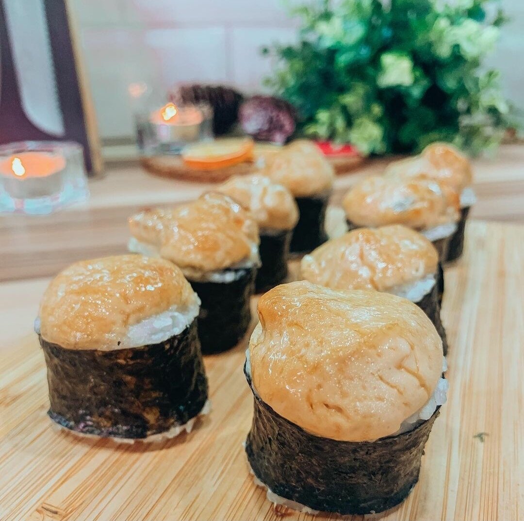 Для приготовления соуса смешать все ингредиенты и выкладывать соус сверху нарезанных роллов. Духовку разогреть на 200 градусов и отправляем туда роллы на 5-10 минут.