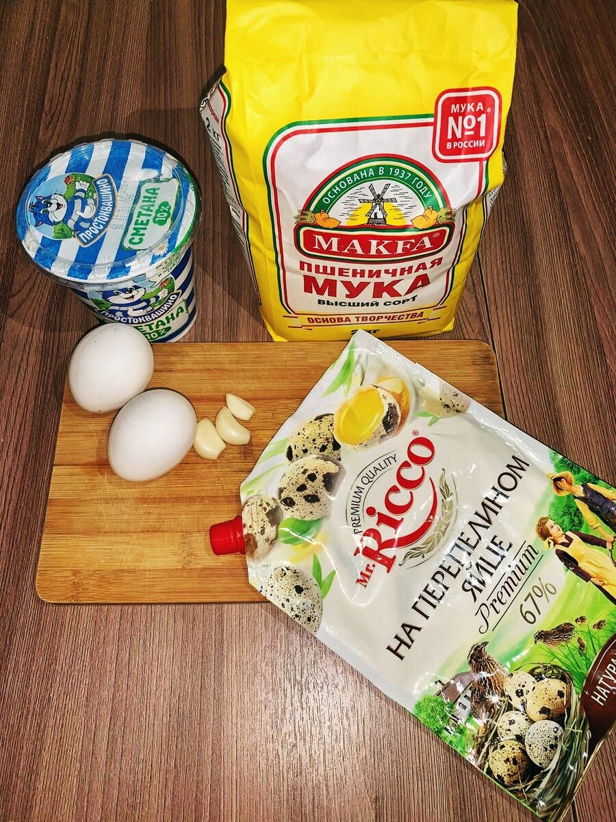 Для теста нам понадобятся: 2 яйца, 4-5 ст. ложек сметаны, 4-5 ст. ложек майонеза, 8 ст. ложек муки, пара зубчиков чеснока.