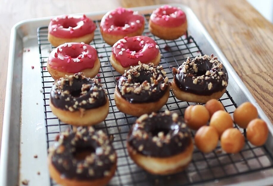 В завершении растягиваем тесто и вырезаем стаканом круги с отверстиями внутри. Покрываем пончики пекарской бумагой и оставляем на 45 минут, чтобы они увеличились в объеме. Потом обжариваем в кипящем масле с каждой стороны, переворачивая время от времени, до коричневого цвета.