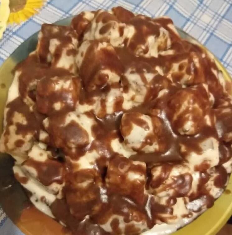 Кремом обмазываем шоколадный корж. Далее мы окунаем кубики белого коржа в крем и выкладываем горкой на нижний слой.
