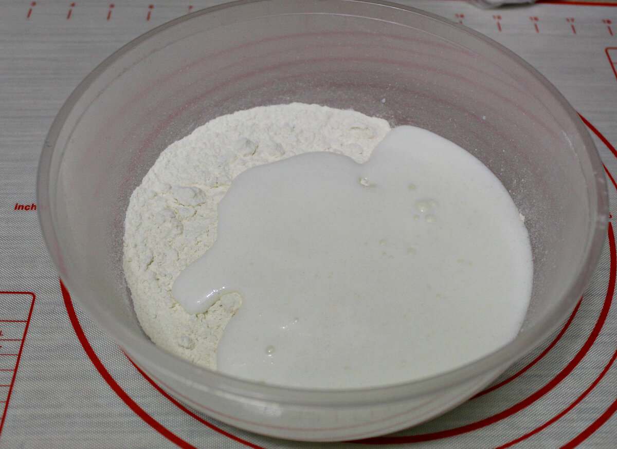 2. Далее добавляем данную смесь в чашу к просеянной муке