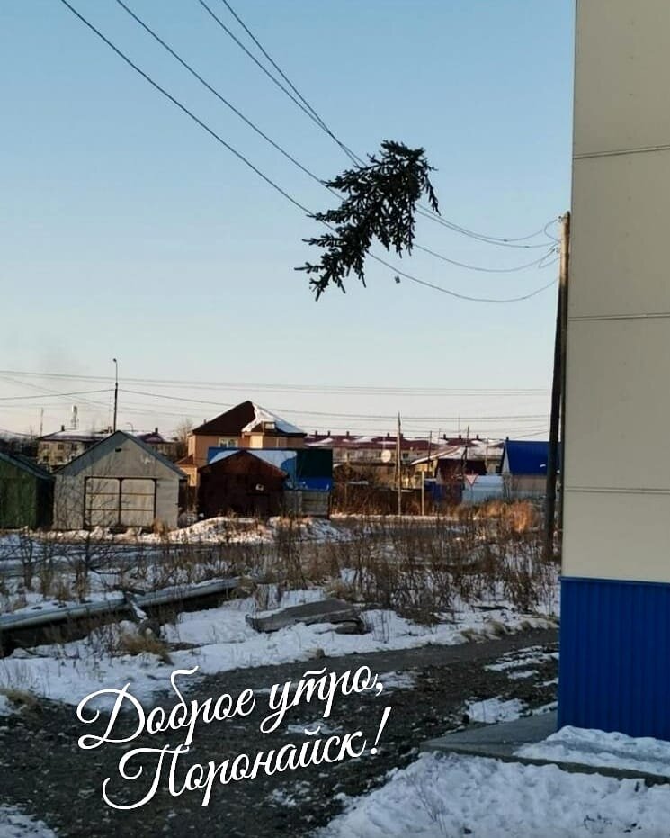 Левитирующая поронайская ёлка - всё! Работник ВЭС "Сахалинэнерго" Дмитрий Поляков легко и непринужденно, словно не в первый раз, снял главный атрибут новогодья с проводов. И на помойку