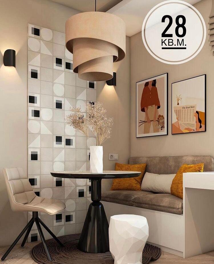 Общее жилое пространство в 19 кв.м. разделили на три зоны: кухня, спальня и гостиная с обеденной.