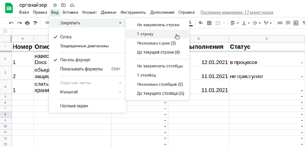 Эта функция полезна, если ваша таблица большая и при пролистывании скрывается ее заголовок. Чтобы закрепить строку или несколько необходимо набрать "Вид" -> "Закрепить" -> "1 строку" (или выбрать несколько):