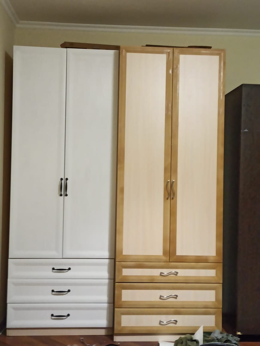 После покупки белой кровати в Икеа шкаф цвета дерева перестал вписываться в интерьер. И был еще один шкаф темного цвета с другими ручками.