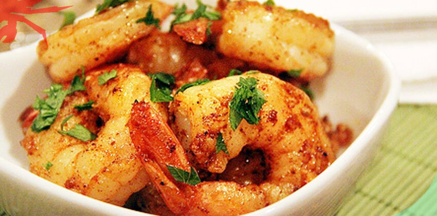 Далее добавляем в сковороду креветки и обжариваем по 2 минут с каждой стороны. Затем выключаем сковороду, сбрызгиваем лимонным соком, добавляем зелень. Блюдо готово. Приятного аппетита!