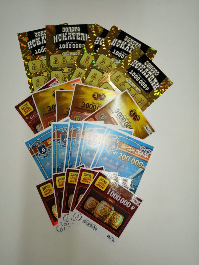 В этот раз я купил лотереи на 1500 рублей. Десять билетов по 100 рублей, и десять билетов по 50 рублей. Лотереи по 100 рублей это "Золотоискатели", "4из20", "Русское лото". И билеты по 50 рублей это