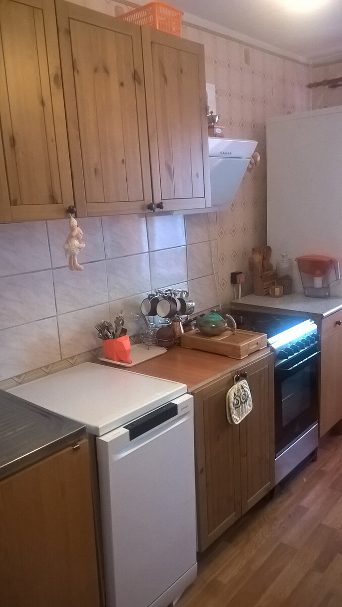 Кухонный гарнитур покупали в Икее вместе со столешницей, а также керамической мойкой. Фартук выполнен из плитки Cersanit в стиле печворк.