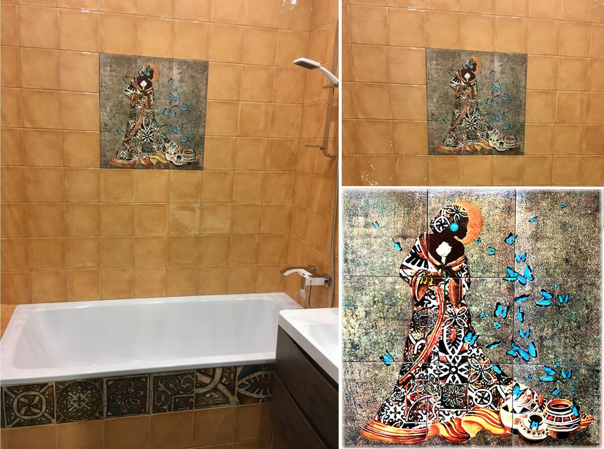 Коллекция керамической плитки уже была куплена. Хозяева выбрали ее в знойных африканских цветах. Орнамент плитки также наводил на мысли об Африке. При этом хотелось как-то разбавить ровный песчаный цвет стен ярким акцентом.