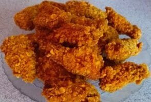 Когда курица хорошо промариновалась, кусочки филе и крылья обваливают в муке, потом во взбитых яйцах и кукурузных хлопьях с сухарями. Получается тройная панировка, которая надежно удерживает влагу внутри мяса, благодаря чему курица получается нежной и невероятно сочной. Подготовленные кусочки домашней курицы KFC опускают в разогретое масло (фритюр) и равномерно обжаривают с двух сторон до образования золотистой румяной корочки.