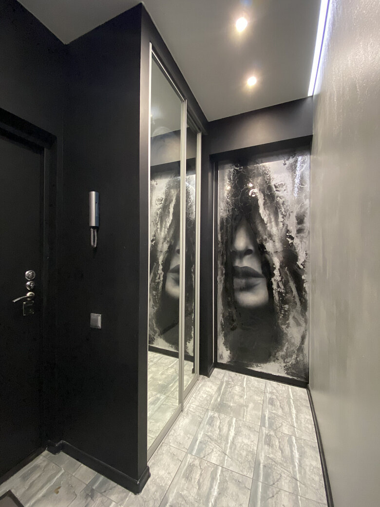Черно-белая роспись продолжает интерьер прихожей, которой также свойственны черные, графичные линии.