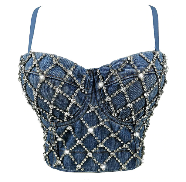 Модный укороченный топ со стразами пуш-ап. Джинсовый женский сексуальный бюстгальтер. Блестящий топ для вечеринки с высокой талией.