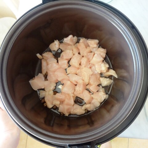 Нарезаем куриную грудку на кусочки размером примерно в 1 см. На дно чаши мультиварки наливаем немного растительного масла, включаем программу «Жарка» на 15 минут и обжариваем кусочки курицы.