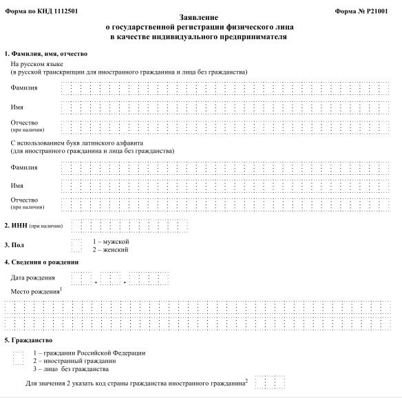 Для регистрации гражданина в качестве предпринимателя 25 января 2012 года была разработана и утверждена форма Р21001. С течением времени она меняется, как и правила ее заполнения, поэтому настоятельно рекомендую пользоваться формой, опубликованной на официальном сайте ФНС! Последняя версия этой формы была утверждена в 2020 году (Приказ ФНС России от 31.08.2020 № ЕД-7-14/617@) и вступила в действие с 25.11.2020. Эта форма не сложна по своему содержанию, но нередко вызывает у начинающих предпринимателей ряд трудностей, которые лично я связываю с официальной инструкцией ФНС по ее заполнению (ознакомиться можно вот тут: http://www.consultant.ru/cons/cgi/online.cgi?from=362347-37&rnd=622C8A8EB59C9A6E1FD7A8A1A035AB97&req=doc&base=LAW&n=373466&REFDOC=362347&REFBASE=LAW#6nj5oh0y8bc).