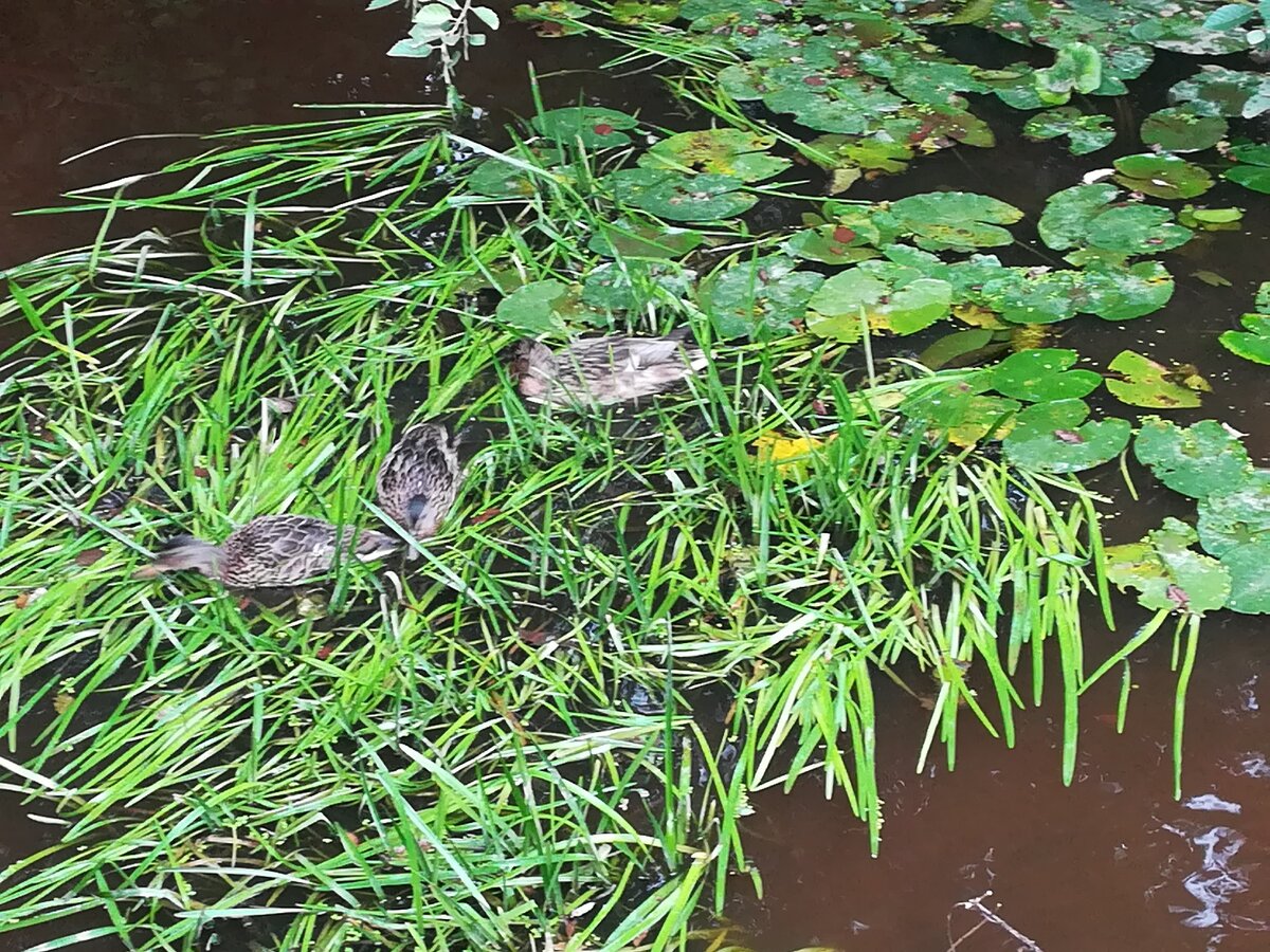А вот утиное семейство прилетает, точнее, приплывает к нам ежегодно. Сначала парой, а потом с выводком сидят на пляжике обмелевшей реки, забираются, когда нас нет, на мостенки.