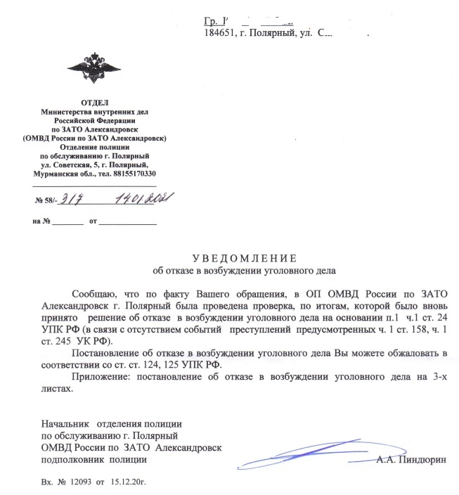 Решил все таки обжаловать) И чтоб вы думали?) Пишите вышестоящим! Пишу, звоню они мне в ответ ну вы на месте решайте в рамках УПК РФ! Блядь- это как ? если ни кто не обращает внимание ни на ст.124 УПК ни на 125 УПК!!!, ни чего не хочет делать. Суд отказывает, т.к. нет материалов проверки, проверку тупо прекратили. Что еще делать????
