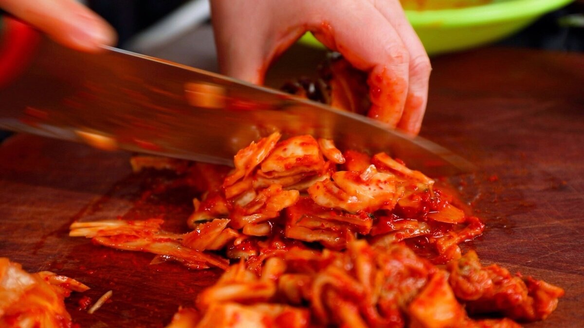 Разогрейте масло, добавьте в сковороду кимчи и лук; жарьте, помешивая 1 минуту. Добавьте сахар c кочудяном и продолжайте мешать еще 4 минуты, пока кимчи не станет мягким, а лук прозрачным. Выключите огонь и полейте кимчи кунжутным маслом. Подавать с рисом, хранить в пластиковом контейнере не более 1 недели.
