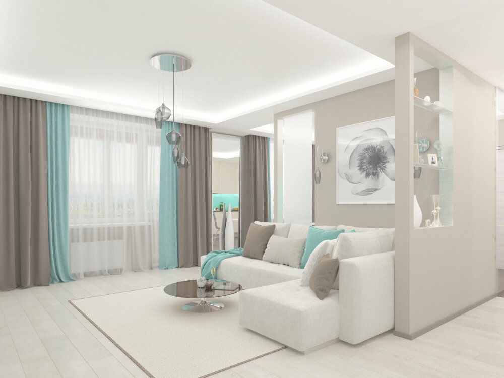 Интерьер спроектирован в стиле минимализм. Использована приглушенная контрастная гамма, почти в каждом помещении присутствует бирюзовый цвет. Геометрия проста и выражена в отдельных элементах.