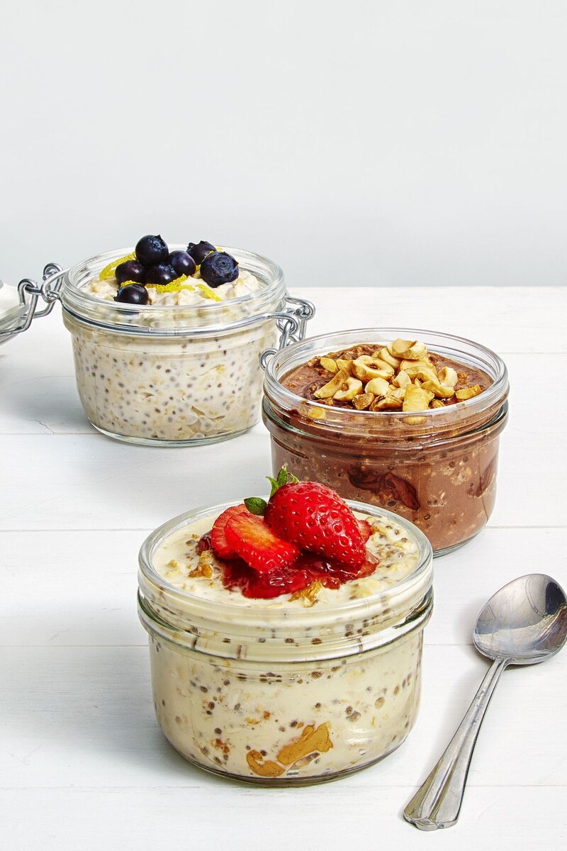 Черника-Кокос: в каждую из четырех банок 1/2 стакана овсянки, 1 столовую ложку семян чиа, 1 столовую ложку меда и 3/4 стакана кокосового молока. Накройте крышкой, встряхните, чтобы соединить и поставить в холодильник. Чтобы подать на стол, размешайте 1/4 чайной ложки лимонной цедры в каждой банке и сверху положите чернику.
