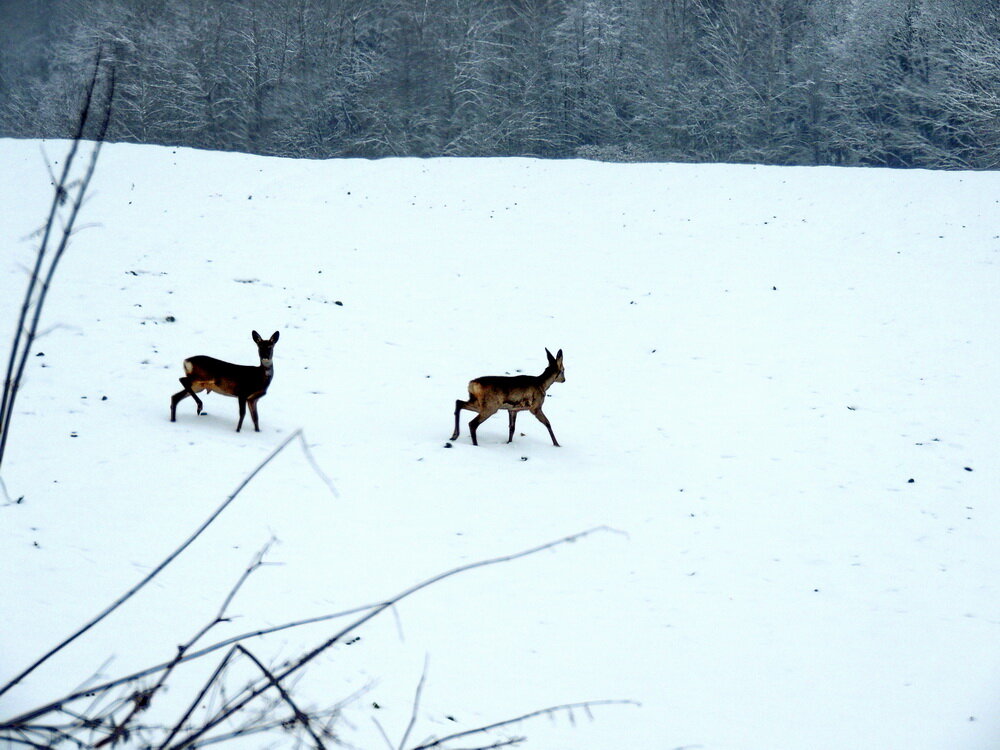 Не успели начать путь, как встретили двух молодых косуль. Они, даже, не испугались автомобиля. Это первый большой снег в их жизни и для них, подобное явление, как чудо, которое надо освоить.
