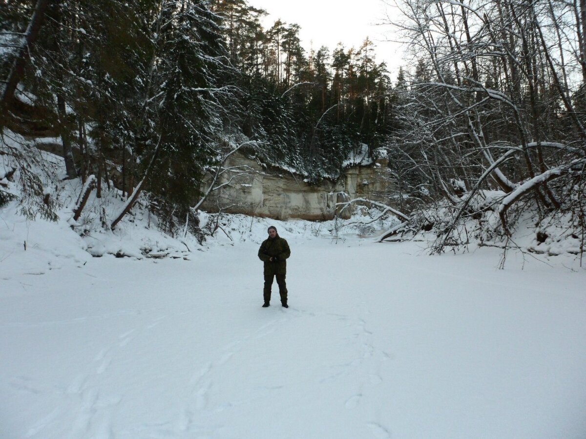 А вот потом настало время задуматься, что же делать дальше. Паники у меня не было - зимой купался регулярно, в прорубях и открытой воде. Но все-таки был сильный мороз, -20, а до машины идти целых полчаса. Хотелось дойти до машины поскорее, а через лес, да еще карабкаясь вверх по склону - это долго... Пошли по льду реки, думали, что так будет быстрее. Как потом оказалось, это была ошибка - река делала много петель, расстояние оказалось большим, да еще по льду шли не очень быстро, так как боялись провалиться снова, я щупал палкой лед везде, хотя родников уже не было. В итоге у машины мы оказались лишь через полчаса. За это время одежда на мне, пропитанная водой, превратилась в лед. Штаны совершенно окаменели, штанины были прямые, как трубы, их можно было ставить вертикально на землю.