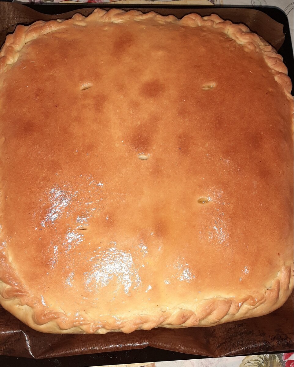 Второй кусок теста также раскатываем и закрываем начинку. Защипываем края. Далаем небольшие надрезы сверху. Это нужно чтобы выходил лишний пар. Смазываем пирог яйцом, отправляем в духовой шкаф разогретый до 180* примерно минут на 40."+-". Пирог хорошо зарумянился достаём его из духовки, пока ещё горячий смазываем сливочным маслом накрываем пищевой плёнкой и полотенцем даём отдохнуть 10 минут.