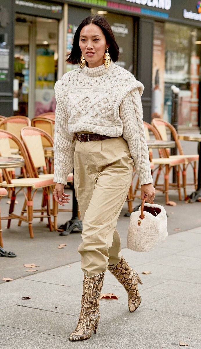 Существует ложное убеждение, что мода - это только про вещи. На самом деле сами способы стилизации имеют чуть ли не большее значение. Потому что даже достаточно старые и видавшие виды свитера и брюки могут приобретать очень свежий с точки зрения тенденций вид. Достаточно стилизовать их непривычным способом. Так что, если вы не хотите тратиться на новую одежду каждый сезон (в чем собственно и нет нужды), но хотите оставаться в тренде, то эта статья для вас! Давайте посмотрим на формулы образов, которые сейчас на пике популярности: 1 Свитер + брюки, заправленные в сапоги Вообще "брюки в сапоги" - реальный хит сезона. Только будьте внимательны: не узкие джинсики в сапожки по колено, а объемные брюки в сапоги с широким голенищем. Тогда получится нужный эффект. Свитер ASOS (2 990р), Брюки в клетку Vero Moda (3 890р), Кожаные сапоги ASOS (9 390р) 2 Блейзер + футболка + узкие джинсы + высокие сапоги Если мы все-таки используем для этого приема джинсы, то сапоги обязательно должны быть широки