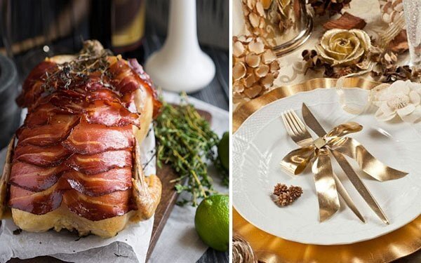 Курица по-царски с беконом Начинка: Нарежьте мелко половину луковицы, а так же половину яблока, очистите 2 головки чеснока, и не забудьте захватить 1 ст. л арахиса. Соедините все наши ингредиенты со 150 г любого фарша (свинина+телятина), а так же добавьте пару ложек панировачных сухариков, всё это посолите и добавьте специи по вкус. Приготовление: Тушку курицы тщательно вымойте и протрите бумажными салфетками. Начините нашу курицу , и тем самым скрепите её отверстие нитками и зубочистками, а так же обмажьте её сливочным маслом. Полосками бекона обложите грудь курицы, скрепив все места стыков зубочистками. На низ противеня выложите любые травы (тимьян, мята), плотно заверните курицу фольгой и выпекайте в духовке при 180 градусах, полтора часа. Когда останется 15-20 минут снимите фольгу дав нашей курочке слегка подрумяниться. @VSEOBOVSEM Рубрика #Готовить просто