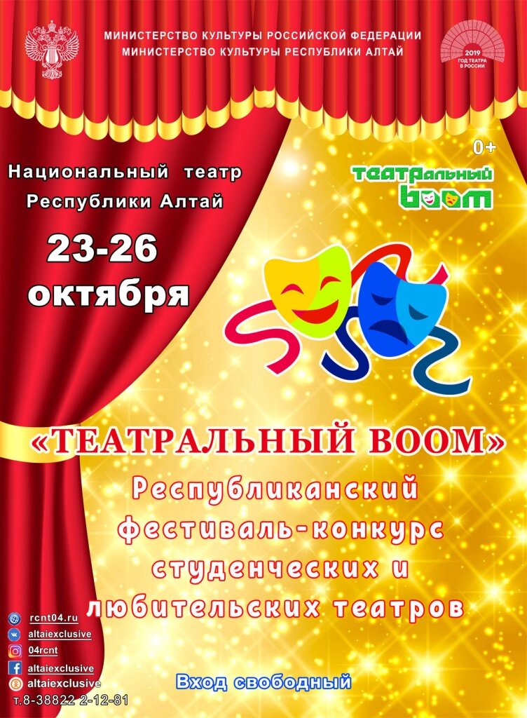 Республиканский фестиваль-конкурс студенческих и любительских театров «Театральный BООМ» пройдет в Горно-Алтайске 23-26 октября 2019 года. Мероприятие будет посвящено Году театра в Российской Федерации.