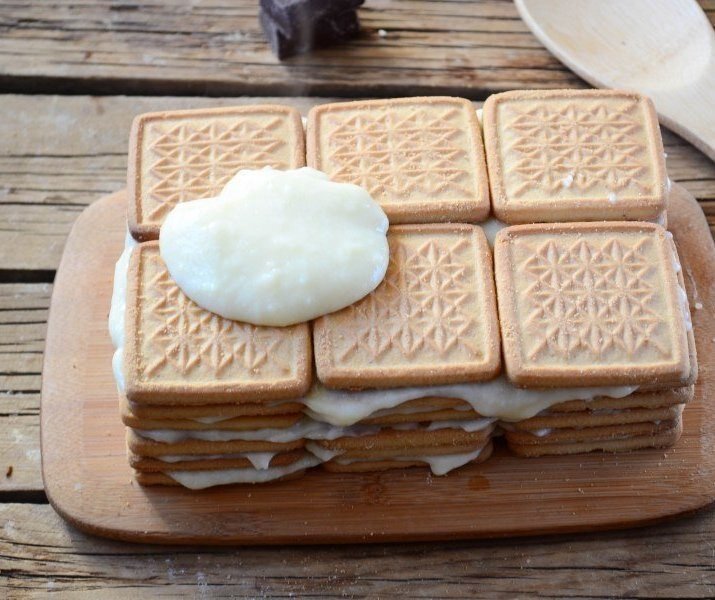 Торт из печенья с заварным кремом Ингредиенты: Печенье — 36 шт. Молоко — 500 мл Мука — 2 ст. л. Яйца — 2 шт. Сахар — ⅔ стак. Приготовление: 1. Подготовьте все необходимые ингредиенты. Печенье не обязательно использовать молочное, можно взять и обычное песочное. 2. Приготовьте крем. Для этого сначала смешайте яйца с сахаром, а затем перемешайте их венчиком до растворения сахара. В пену взбивать не нужно. 3. Всыпьте муку и хорошенько размешайте массу до однородности. 4. В последнюю очередь влейте сначала половину молока (и полностью размешайте), затем остальное молоко и снова размешайте до однородности. 5. При такой последовательности смешивания комочки не должны образоваться. 6. Варите крем на медленном огне до загустения. Степень густоты контролируйте сами. 7. На блюдо или поднос выложите печенье по 3 шт. в два ряда (или по своему желанию). Смажьте первый слой кремом. 8. Снова накройте печеньем и смажьте кремом. Так продолжайте со всем остальным печеньем. Готовый торт сверху и по б