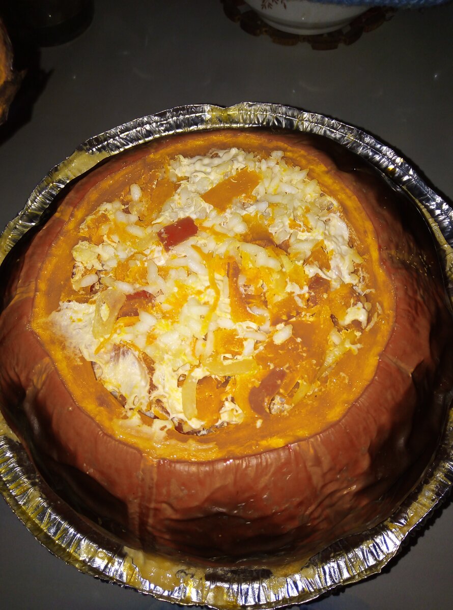 Раньше я тыкву не готовила. А в этом году у моей сестры большой урожай овощей. В том числе и тыквы. Делала из неё запеканку, кашу пшенную, пирог. И вот захотелось приготовить целиком небольшую тыковку. Для приготовления понадобится : Небольша тыква Куриное филе Болгарский перец Рис Луковица Морковь Соль Подсолнечное масло Приправы по вкусу. Ингредиенты брала на глаз, чтобы поместились в тыкву. С тыквы срезать верхушку, это будет " крыжечка". Вытащить семена и мягкие волокна. Выскоблить немного ложкой. Смазать внутри тыкву маслом и солью. Рис предварительно отварить до полуготовности. Курицу порезать на маленький кусочки, лук полукольцами. Можно и кубиками. Морковь натереть на крупной тёрке. Болгарский перец нарезать кубиками. Все перемешать. Наполнить тыкву смесью и налить немного воды. Тыву обернуть фольгой или поставить в одноразовую форму. Выпекать в духовке при температуре 180-190 градусов. Примерно час, чуть больше. До готовности. При подаче лучше все перемешать с тыкв