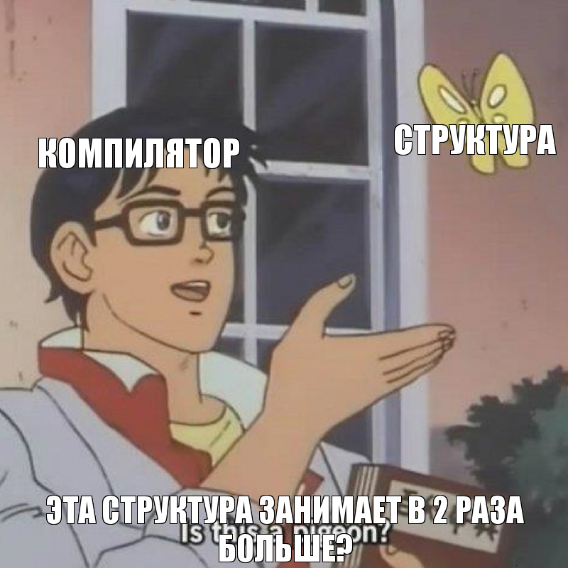 Что такое структуры мы знаем,как с ними более комфортно работать-тоже.Казалось бы,что ещё нужно? Си готов преподнести вам ещё парочку сюрпризов. Перед дальнейшим прочтением попробуйте собрать такой код: struct { char ch; int tmp1; short tmp2; }typedef mystu; int main() { mystru tmp; printf("%d\n",sizeof(tmp)); return 0; } Любопытное число,правда? Получается наша структура занимает 12 байт в памяти,создаётся впечатление,что компилятор получал двойки в первом классе и так и не освоил сложение.Давайте посчитаем за него: char занимает 1 байт; int занимает 4 байта; short занимает 2 байта; Всего должно получиться 7 байт,откуда 12?! Сплошная мистика,попробуйте пересобрать программу с такой структурой: struct { char ch; short tmp2; int tmp1; }typedef mystru; Здорово,правда? Мы всего лишь поменяли местами пару переменных в структуре,а она уже занимает на целых 4 байта меньше.А теперь,когда я вас заинтересовал самое время продать вам полную версию этого у