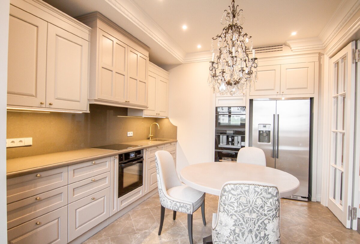 Недавно завершили ещё один проект кухни. В этот раз пойдёт речь о кухне в американском стиле, выполненной в светло-сером цвете. Американский стиль имеет свой уникальный почерк, который, на самом деле, сложно уловить. Эти кухни, с одной стороны, имеют классические стилистические решения, с другой стороны, они современные по своему духу. Как правило, фасады американских кухонь имеют объёмные филёнки, но при этом простые декоративные детали, которые характерны для неоклассических кухонь. Обязательным элементом в любой американской кухне является портал. Именно в американских интерьерах, во многом, портал (как элемент кухни) получил отправную точку для развития. Просматривая проекты, выполненные в таком стиле, можно сразу же понять, что возможны самые разные варианты порталов – подвесной, с колоннами, из гипсокартона и металла. В нашем случае был выбран подвесной вариант портала, который дизайнером был сознательно увеличен по высоте. Небольшой ненавязчивый карниз внизу портала, подчёркива