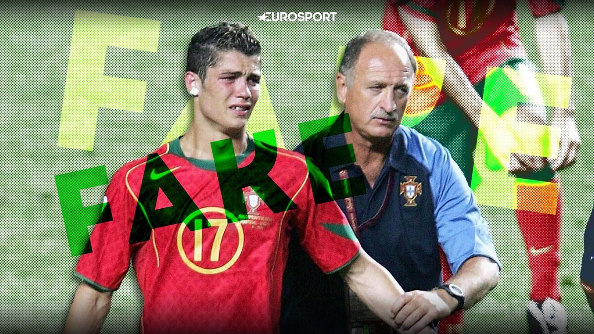 Разбираем знаменитый вброс. В начале 10-х в соцсетях, особенно в пабликах «Вконтакте», гуляла душераздирающая история про трагедию в семье Криштиану Роналду. Картинка с плачущим на поле Кришем сопровождалась подписью, что в эту секунду футболисту сообщили о смерти отца. В большинстве постов Рон «узнавал» о трагедии после финального свистка, но иногда для слезогонки печальное событие переносили в разгар матча, который Криштиану героически доиграл до конца. Пик фейка пришелся на 2012-й, но всплывал он и в последующие годы. В 2016-м умельцы заделали даже очень кривое видео. В итоге даже в 2019-м за использование гифки/картинки с Роналду в слезах можно оказаться заклейменным. Что же изображено на фото? Кадр сделан во время Евро-2004 – это легко понять по соответствующему логотипу на правом рукаве. Точнее – после финала турнира. В тот вечер, 4 июля, находившееся на пике золотое поколение Луиша Фигу на глазах 62-тысячных домашних трибун «Эштадиу да Луш» проиграло главный на тот момент матч в