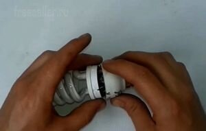 Поддев отверткой разбираем лампочку. Зачастую в энергосберегающих лампочках сгорает одна из двух спиралей, цепь прерывается и ко второй последовательно подсоединенной спирали перестает идти ток.