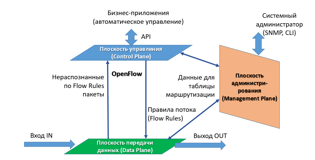 Источник: https://shalaginov.com/2019/10/21/6534 Ответ – ни то, ни другое. Работа Openflow заключается в модификации содержания таблицы передачи пакетов внутри маршрутизатор или коммутатора (FORWARDING table). Поэтому, это не протокол маршрутизации и не протокол коммутации. Архитектура сетевого оборудования часто описывается в виде трех плоскостей: администрирования (management plane), управления (control plane) и передачи данных (data plane) и иллюстрируется такой схемой. Плоскость администрирования (Management Plane) устанавливает режимы работы устройства, модифицирует версии т.н. фирменного ПО (firmware), жестко «зашитого» в сетевое устройство, выполняет команды простого протокола администрирования сети SNMP (Simple Network Management Protocol) от внешней системы администрирования сети NMS, а также команды внешней конфигурации устройства через интерфейс командной строки CLI (Command Line Interface). Плоскость передачи данных (Data Plane) передает пакеты и кадры (frame) данных со