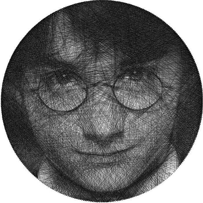 Художник из Гонконга, Альфред Чен, создает потрясающе точные портреты знаменитостей, используя нить длиной более 5000 метров и рамку с 300 металлическими гвоздями. Он выбирает цифровое изображение, например, актера, затем делает из цветной версии серую, регулируя яркость и контрастность, чтобы лучше раскрыть тени и блики, а потом с помощью алгоритма принимается наматывать нить на рамку. Художник должен быть очень осторожным, ведь одно неловкое движение — нить обрывается и кропотливый процесс начинается заново.